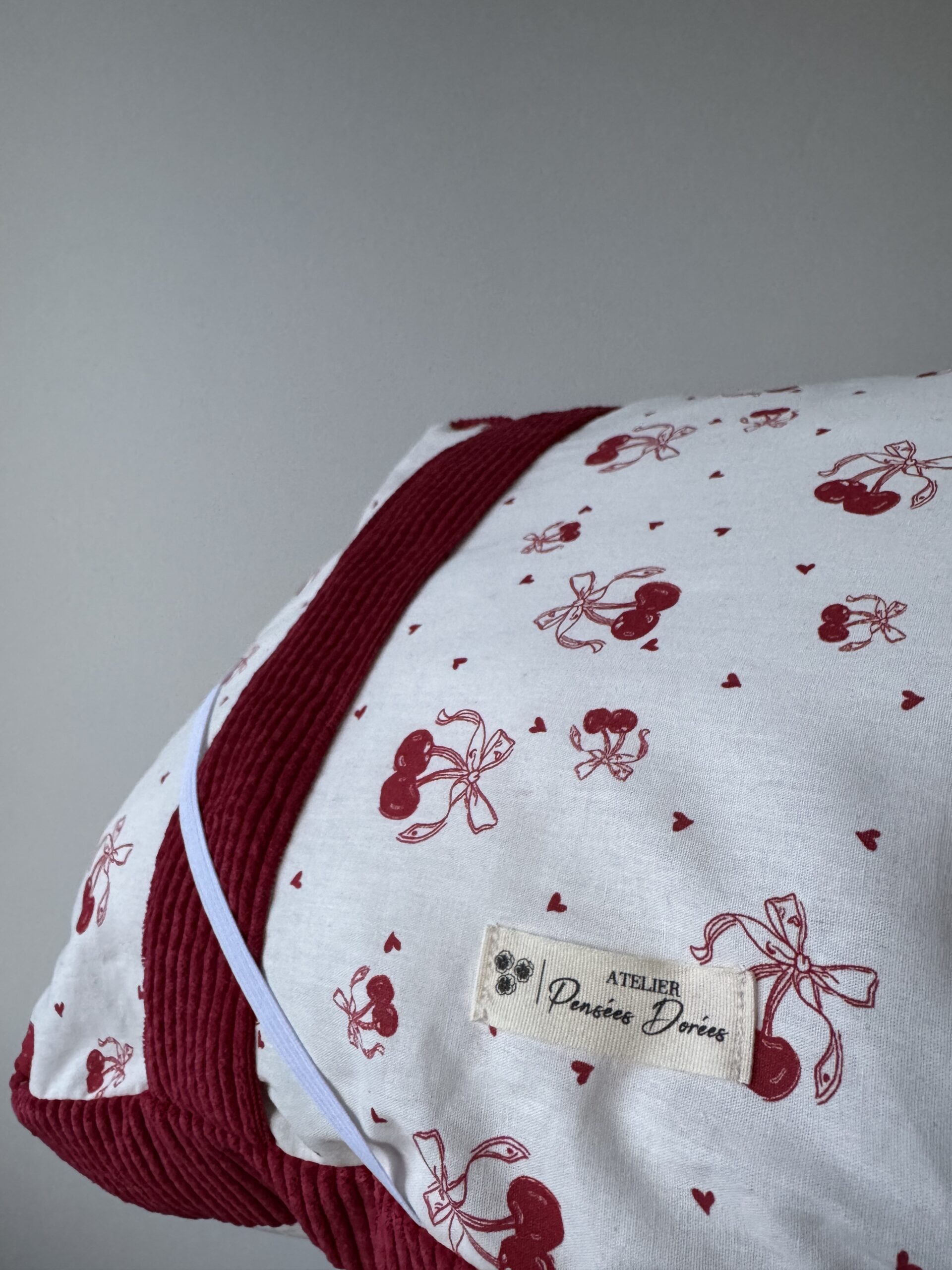 • 🌸 Tissu devant/derrière: coton motifs cerises, rubans, cœurs